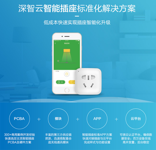 深智云智能插座标准化产品解决方案,通过完整的“PCBA+模块+APP+云”产品模式,一站式标准化打造智能插座,实现远程遥控、定时延时开关、固件升级等智能化功能,帮助厂商消灭开发、供应商寻找等中间环节,最大化智能升级效率。一般来说,智能产品开发通常具有“技术门槛高、开发周期长、研发成本大”等限制因素,深智云智能插座标准化产品解决方案是如何实现智能产品的快速、稳定、低成本的打造的呢?