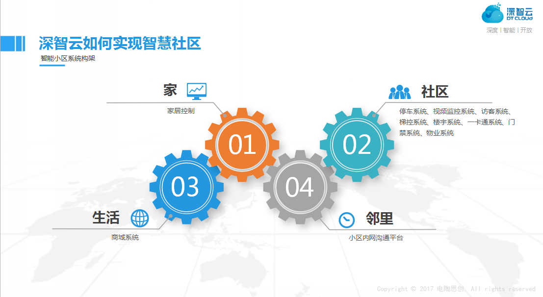 深智云智慧社区解决方案,是深智云根据社区行业大量数据调研分析,综合各方需求提出的包含硬件开发接入、细分功能子系统、物业管理后台、业主/商家APP在内的,具备物联网属性的完整解决方案,帮助开发商、物业服务商、弱电集成商、硬件供应商等社区行业各方实现业务转型、升级,并促进智慧社区行业良性发展。