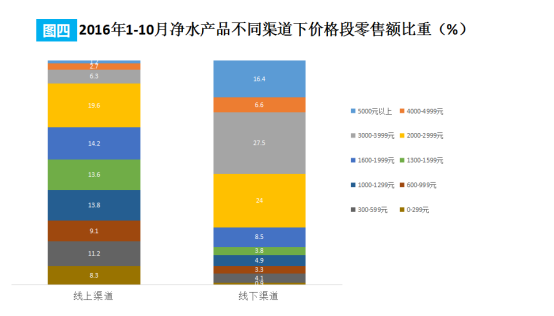深智解读:根据奥维云网的数据显示,线下消费者倾向于高端产品,3000元以上产品比重超过半数,而线下消费者对价格的敏感度较高,更倾向于产品的性价比。同时,根据近几年的数据,线上的销售额占比虽然低于线下,但其增速比线上高处许多,线上市场的份额将越来越大。相关净水厂商和经销商,在不同渠道的销售过程中,可以充分考虑不同价格段产品的布局与营销方式的选择,以达到最优的销售组合。
