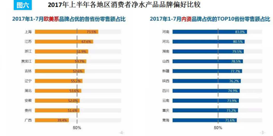 深智解读:从奥维云网的监控数据可知,中原、西北、西南地区的消费者偏好国内品牌的净水产品,而江浙沪和东北地区的消费者更青睐欧美品牌。不过,据《报告》强调,2017年上半年,净水设备线上市场国内品牌市场份额快速扩大,占比达到71.8%,国外品牌的占比仅为三成,国内品牌市场逐渐扩大。无论是外资品牌还是内资品牌,建立自由品牌形成品牌影响力将是净水厂商扩大市场的有力手段。
