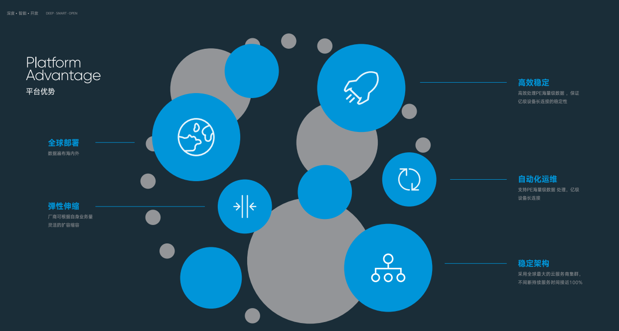 深智云作为行业内极具创新能力的物联网云平台,首款物联网搜索引擎缔造者,汇聚华为、百度、腾讯、富士康、普联、华邦云等近100位专业背景人才,专注于智能家居、智慧社区、楼宇办公、智能健康、智能硬件、智慧工业六大细分领域,提供物联网纵向一站式服务,包括智能产品打造、超级APP开发、私有云搭建、企业专属SaaS服务,IoT PaaS服务、数据服务等,合作客户超过300家,包括康佳集团、美的集团、荣高智能、启泰灯饰、中控集团、威妮华集团、华润置地、氪空间等。公司总部位于深圳,在苏州设立子公司,佛山设立分公司,总办公面积近3000平方米。