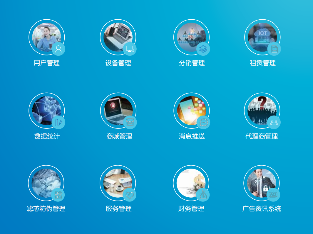 具备用户管理、设备管理、数据统计、滤芯管理等基础功能版块,只需能够满足客户目前需求即可。