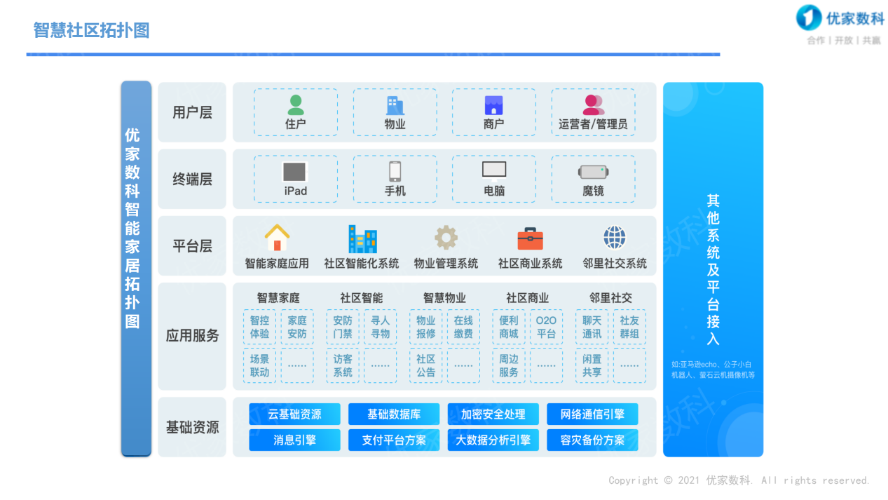 优家数科智慧社区解决方案,是优家数科根据社区行业大量数据调研分析,综合各方需求提出的包含硬件开发接入、细分功能子系统、物业管理后台、业主/商家APP在内的,具备物联网属性的完整解决方案,帮助开发商、物业服务商、弱电集成商、硬件供应商等社区行业各方实现业务转型、升级,并促进智慧社区行业良性发展。