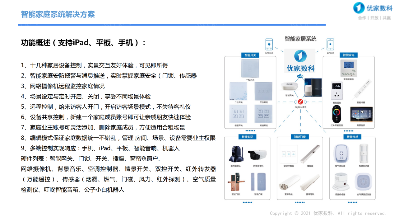 硬件列表:智能网关、门锁、开关、插座、窗帘&窗户、网络摄像机、背景音乐、空调控制器、情景开关、双控开关、红外转发器(万能遥控)、传感器(烟雾、燃气、门磁、风力、红外探测)、空气质量检测仪、叮咚智能音箱、公子小白机器人