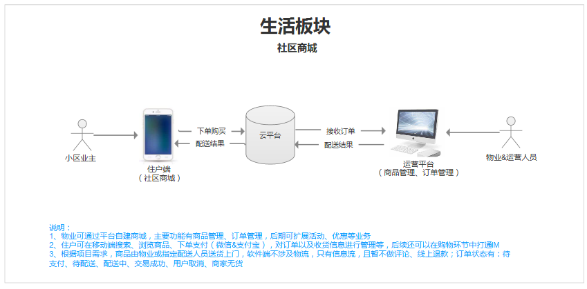 1、社区商城,主打小区一公里闪电送达模式,由物业自建或外包给第三方;住户对于一些急用性物品(柴米油盐),可以在社区商城购买(支持微信、支付宝支付),闪电送达,方便又实惠