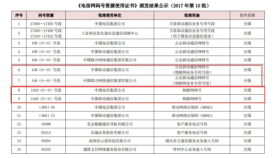 8月7日,工业与信息化部颁布2017年第10批《中华人民共和国电信网码号资源使用证书》。证书显示,三大运营商获得了新的物联网号段。其中,中国移动获得了148(0-9)号段(物联网业务专用号段)、1440(0-9)号段(物联网网号);中国电信获得了1410(0-9)号段(物联网网号);中国联通获得了146(0-9)号段(物联网业务专用号段)。物联网专用号段的颁发,说明通信运营商正式参与物联网运营,物联网业务将规范化,明确化。获得物联网号段,就能开始正式发展下游客户,建立各种物联网业务。接下来相关的基础设备设施采购也会紧锣密鼓展开,物联网应用将正式进入开始爆发的关键时刻。