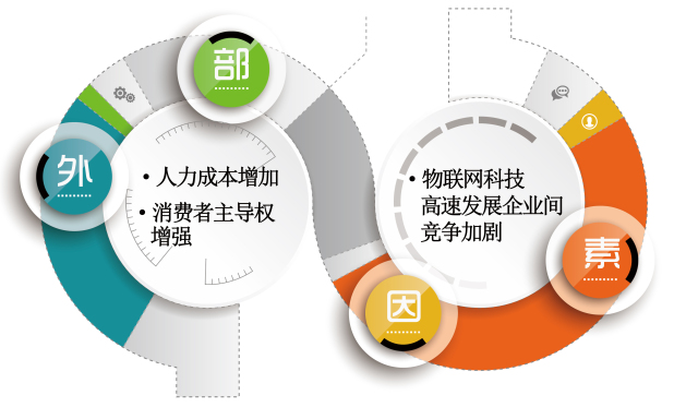 除了上述内部原因,外部环境的改变也让众多传统企业无所适从。随着我国经济的高速发展,人力成本增加,以往依靠相对低廉的劳动力来扩大发展的模式已经不再适用,技术、渠道、商业模式等影响因素逐渐登上舞台中央,成为决定企业发展的核心要素。