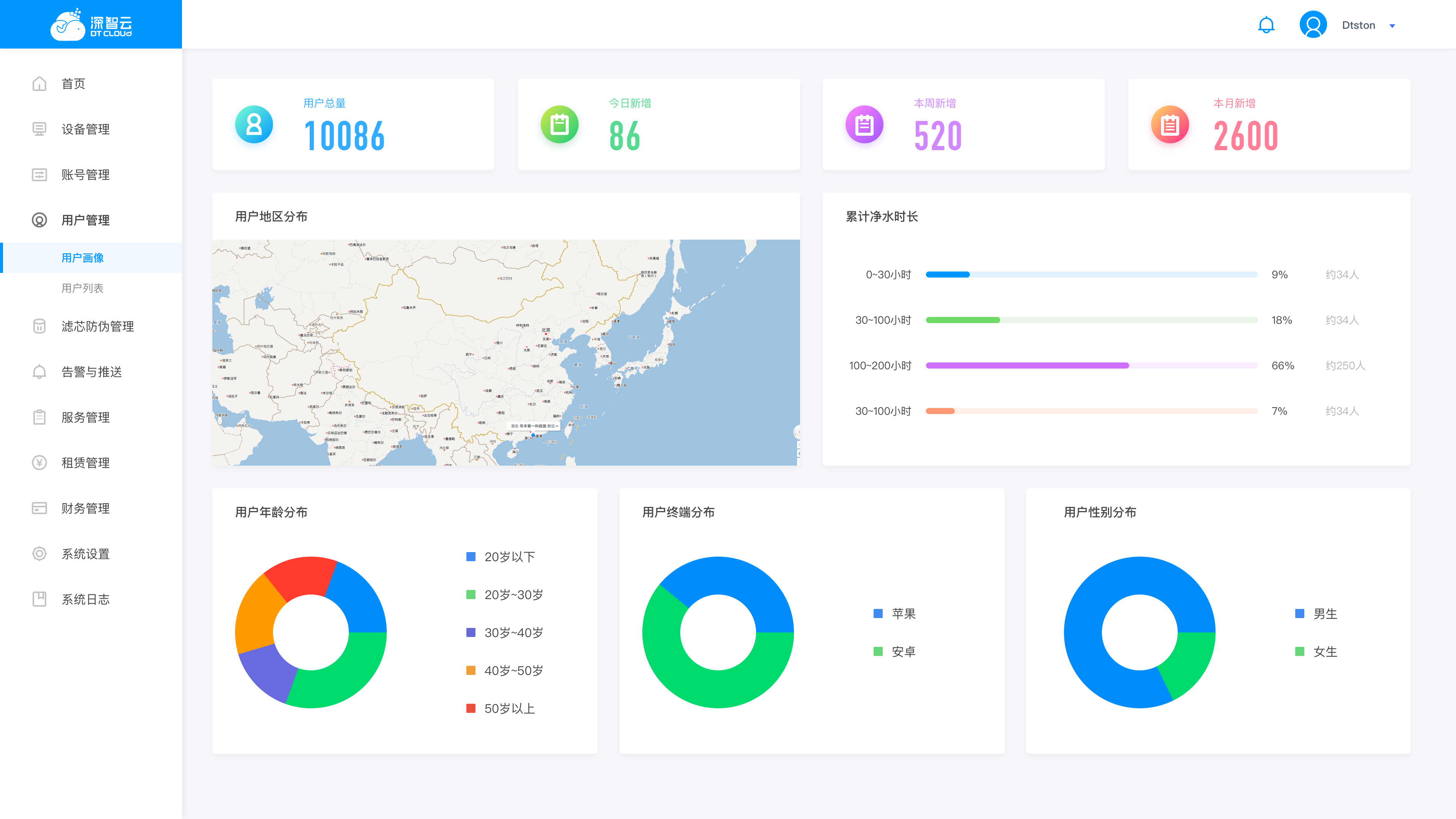 具备用户管理、设备管理、数据统计、滤芯管理等基础功能版块,只需能够满足客户目前需求即可。